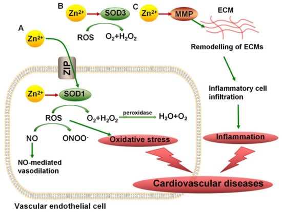 Cardiovascular disease (CVD) is the general term for diseases related to the heart and circulatory system, which have become the main cause of death in the world. An increasing number of studies have identified that chronic inflammation and oxidative stress are risk factors for CVDs. Excessive ROS can damage the structure and function of vascular endothelial cells, affecting the generation and progression of CVDs. Since antioxidant copper/zinc superoxide dismutase (Cu/Zn-SOD) has been well known to balance the ROS inside and outside the cell, various studies have focused on the importance of the SOD-mediated antioxidant system in the antioxidant treatment of CVDs []. It has been reported that in SOD1-knockout mice, the level of ROS in blood vessels increased and NO-mediated vasodilation decreased, which made blood vessels more vulnerable to damage []. Under the condition of exogenous SOD treatment, hypertension and endothelial relaxation damage can both be alleviated []. Zn2+ has been reported to be responsible for maintaining SOD activity. Zn2+-binding sites have been observed in both SOD1 and SOD3. According to an experiment in rats treated with the Zn2+ chelator TPEN, TPEN-induced Zn2+ depletion led to an increase in the size of myocardial infarction by inhibiting SOD activity []. Majewski et al. revealed that resveratrol has been shown to improve blood vessel conditions by increasing SOD activities, which may be induced by an increased concentration of Zn2+ []. The potential protective mechanism of Zn2+ in cardiovascular diseases through controlling SOD activity is shown in Figure 2A,B.