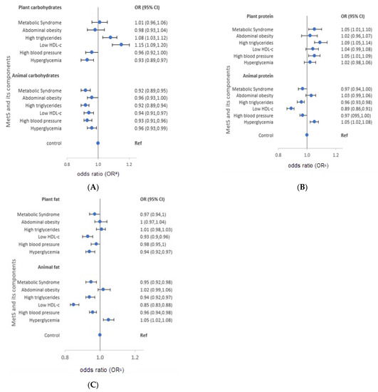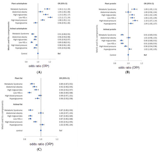 The characteristics of macronutrient intake according to MetS components also varied according to the source of macronutrients. Men with high triglycerides had a high intake of plant carbohydrates and proteins (OR = 1.08 and 1.09, respectively), but low intake of animal carbohydrates, protein, and fat (OR = 0.92, 0.96, and 0.94, in order). Similarly, men with low HDL-cholesterol reported high intake of plant carbohydrates (OR = 1.15), and low intake of animal protein and fat (OR = 0.89 and 0.85, respectively). Men with high blood pressure had a high intake of plant protein (OR = 1.05), and a low intake of animal carbohydrates and fat (OR = 0.93 and 0.96, respectively). High intake of plant protein (OR = 1.05) and animal fat (OR = 1.05), but low intake of plant fat (OR = 0.94) was observed in men with hyperglycemia. On the other hand, women with high triglycerides had a high intake of plant carbohydrates and protein (OR = 1.13 and 1.06, respectively), but low intake of animal carbohydrates (OR = 0.95). Moreover, women with low HDL-cholesterol had high intake of plant carbohydrates and proteins (OR = 1.21 and 1.06, respectively), but low intake of animal protein (OR = 0.91). High blood pressure among women was characterized by high intake of plant carbohydrates and protein (OR = 1.08 and 1.10, respectively), but low intake of animal protein and fat (OR = 0.96 and 0.93, respectively). Women who had hyperglycemia reported low intake of animal carbohydrates (OR = 0.95). The median macronutrient intake from plant and animal sources for men and women are presented in Supplementary Table S4.