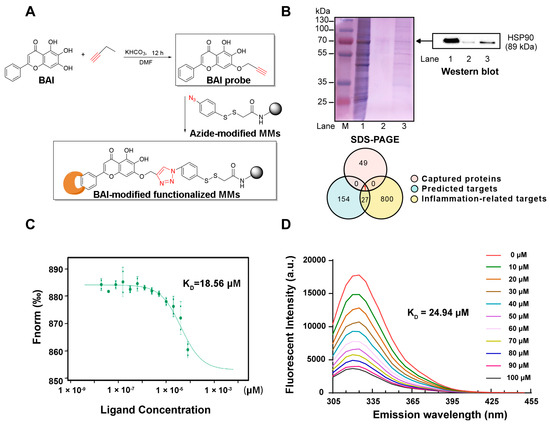 Virtual docking of the three-dimensional structure of BAI (sdf format) was performed using PharmMapper (http://lilab.ecust.edu.cn/pharmmapper/, accessed on 15 June 2020). The potential targets of BAI were determined using a Venn diagram analysis that included the docking data obtained from PharmMapper, the proteins captured using BAI-MMs, and the anti-inflammatory proteins obtained from the GeneCards database (http://www.genecards.org/, accessed on 20 September 2020).