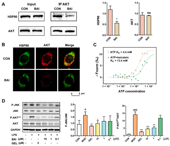 BAI bound to the ATP-binding domain of HSP90 to induce AKT degradation. (A) Co-IP of the HSP90 and AKT proteins with or without BAI (n = 3). * p < 0.05 vs. CON group. (B) Co-localization of HSP90 (pseudo-red) with AKT (pseudo-green) with or without 10 µM BAI administration in RAW264.7 cells. (C) BAI competing with ATP to target HSP90 measured using MST. (D) BAI reduced the expression of P-JNK and P-AKT stimulated using LPS in RAW264.7 cells in a concentration-dependent manner (n = 3). # p < 0.05, ### p < 0.001 vs. CON group; * p < 0.05, ** p < 0.01 and *** p < 0.001 vs. MOD group; ATP, adenosine triphosphate; BAI, baicalein; CON, control; GEL, geldanamycin; HSP90, heat shock protein 90; LPS, lipopolysaccharide.