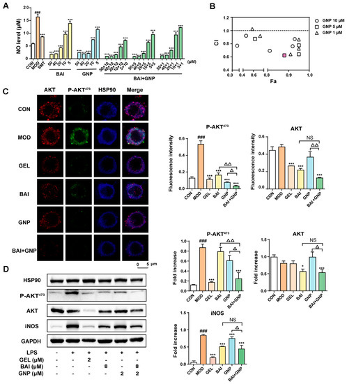Previous studies demonstrated that GNP acts on the pleckstrin homology (PH) domain of AKT and can inhibit the phosphorylation of AKT473 [40]. Thus, we hypothesized that the combination of BAI and GNP had the potential to induce a synergistic anti-inflammatory effect. We indirectly evaluated the combined effect of BAI and GNP on AKT by estimating the production of nitric oxide (NO), a downstream effector of AKT. We found that RAW264.7 cells stimulated with LPS showed significantly increased levels of NO. However, treatment with different concentrations of BAI (5–50 µM) and GNP (5–50 µM) significantly decreased the cellular NO levels. In addition, the combination of BAI and GNP had a more dramatic effect (Figure 3A). Our observations further indicated that BAI and GNP had a synergistic effect, and their optimal molar ratio was 4:1 (pink square shown in Figure 3B). Then, the combination of BAI (8 µM) and GNP (2 µM) was selected for use in the subsequent co-localization and AKT activation tests in the LPS-induced RAW264.7 cells.