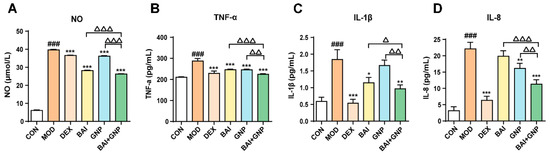 Lipopolysaccharide-induced synergistic inhibition of NO (A), TNF-α (B), IL-1β (C), and IL-8 (D) productions by BAI and GNP (n = 6). Each bar represents the mean ± SD. ### p < 0.001 vs. control group; * p < 0.05, ** p < 0.01, and *** p < 0.001 vs. model group; △ p < 0.05, △△ p < 0.01, and △△△ p < 0.001 vs. combination group. BAI, baicalein; CON, control; DEX, dexamethasone; GNP, genipin; MOD, model; NO, nitric oxide; IL-1β, interleukin 1β; IL-8, interleukin 8; TNF-α, tumor necrosis factor-α.