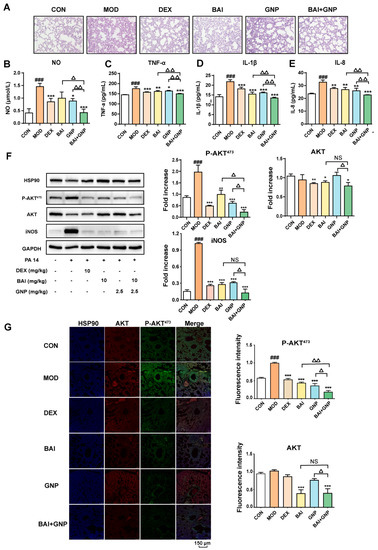 In addition, we analyzed the protein expression in all the groups and observed that the expression of AKT and iNOS in the DEX and BAI groups were lower than those in the model and GNP groups. This indicated that BAI reduced the levels of AKT in the lung tissue, whereas GNP did not. Moreover, phosphorylation of AKT in the lung tissue was observed to be significantly higher in the model group than that in the control group. We observed different degrees of decline in the protein level of P-AKT473 and iNOS treatment with BAI or GNP. Moreover, the administration of both BAI and GNP was more effective in reducing P-AKT473 than that of individual drugs (Figure 5F,G). This observation demonstrated that the combination of BAI and GNP enhanced the anti-inflammatory effect and could effectively improve acute lung injury in mice.