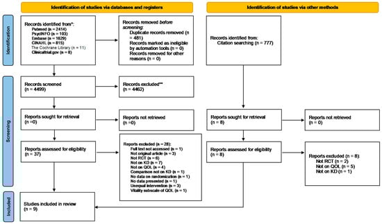 Results of the study selection process are displayed in Figure 1. The initial search resulted in 4980 screened records, out of which nine RCTs were included in this review.