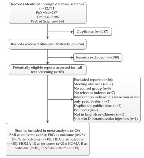 A total of 12,741 potential articles were included after a preliminary search of PubMed, Embase (Ovid), and Web of Science. Among the retrieved articles, 8654 articles were left after removing duplicates. After screening the titles and abstracts, 8589 articles were excluded owing to an irrelevance of the topic. After assessing the full text of the remaining 65 articles, 36 articles were excluded for the following reasons: (1) meeting abstracts (n = 17), (2) no control group (n = 3), (3) no relevant indexes (n = 7), (4) intervention individuals were not or not only prediabetics (n = 3), (5) duplicated publications (n = 2), (6) protocols (n = 2), (7) not in English or Chinese (n = 1), and (8) vitamin D intramuscular injection (n = 1). A total of 29 articles (N = 3792) were included in this meta-analysis (BMI: n = 23; FBG: n = 25; 2h-PG: n = 18; HbA1c: n = 20; HOMA-IR: n = 21; HOMA-B: n = 10; FINS: n = 15). The process of screening and selection is shown in Figure 1.