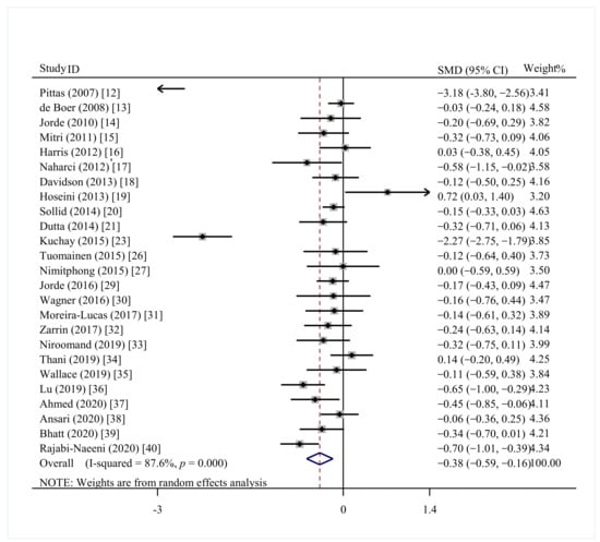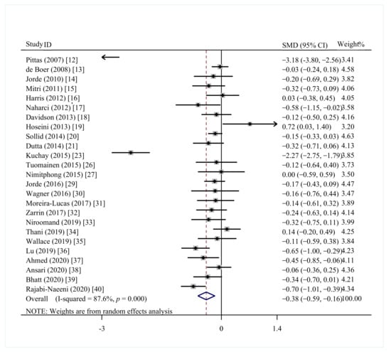 Twenty-five trials involving 3144 participants were included to demonstrate the effect of vitamin D supplementation on FBG in prediabetics [,,,,,,,,,,,,,,,,,,,,,,,,]. Overall, a significant decrease in FBG content was observed in the vitamin D supplementation group (SMD = −0.38; 95%CI: −0.59, −0.16; p = 0.001) (Figure 2), with a high heterogeneity (I2 = 87.6%, p < 0.001). Subgroup analyses suggested similar findings in the following subgroups: Asia, Europe, vitamin D vs. placebo, study duration ≥ 1 year, study duration <1 year, baseline 25(OH)D < 50 nmol/L, and baseline 25(OH)D ≥ 50 nmol/L (Table 2).