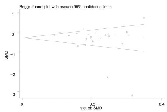 In the sensitivity analysis, the results of BMI, 2h-PG, and HOMA-B levels remained basically robust. The remarkable effect of vitamin D supplementation on HbA1c disappeared when excluding Kuchey et al. [], and a similar trend was found for FINS when excluding de Boer et al. [] and Sollid et al. [], as the heterogeneity decreased to 0.00%. However, the effect of vitamin D on HOMA-IR in prediabetes turned to significant (SMD = −0.23; 95%CI: −0.42, −0.03; p < 0.001), with high heterogeneity (I2 = 82.5%, p < 0.001), when excluding Pittas et al. [] and Bhatt et al. []. In addition, by excluding Pittas et al. [] and Kuchey et al. [] from the meta-analysis, the heterogeneity for the beneficial effect of vitamin D supplementation on FBG decreased from 87.6% to 41.5%.