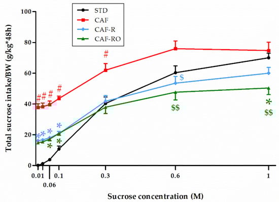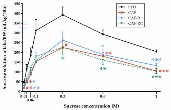 Regarding the total sucrose intake (Figure 4), the results revealed a significant effect of concentration (p < 0.001), and that this effect was different depending on the dietary treatment (‘sucrose concentration × diet’, p < 0.001). The CAF-fed animals consumed the highest total amount of sugar over all sucrose concentrations. The STD group showed the lowest consumption values for the low sucrose concentrations although this increased to similar values to the CAF group at higher concentrations (0.6 M and 1 M). In contrast, both CAF-R and CAF-RO groups displayed intermediate values at low sucrose concentrations (0.01 M to 0.1 M) and the lowest intakes at higher concentrations (0.6 M and 1 M). Thus, at 0.6 M the CAF-R and CAF-RO groups showed lower values than the CAF group (p < 0.05), and at 1 M the CAF-RO group displayed lower intakes compared with both the CAF and STD groups (p < 0.05).