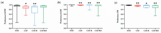 The preference ratios for sucrose solutions are represented in Figure 2. The STD group showed a greater preference for 0.03 M sucrose than the CAF and CAF-R groups, but not than the CAF-RO group (p < 0.05), which indicates a higher preference of CAF-RO group for low sucrose solutions compared with CAF and CAF-R groups. At higher concentrations (0.6 M and 1 M), the preference ratios of the STD group were also the highest and significantly different from all the other groups, whereas no differences were observed between CAF, CAF-R and CAF-RO groups (0.6 M p < 0.01; 1 M p < 0.05). There were no differences on preferences of the other sucrose concentrations among groups (0.01 M, 0.06 M, 0.1 M and 0.3 M).