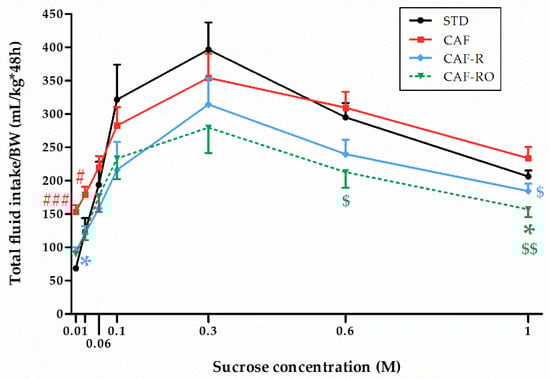 Effects of the dietary treatments on the total fluid intake during the two-bottle preference test. Total fluid intakes (mL) were relativized to the body weight (BW, kg). Data are expressed as the mean ± SEM. * p < 0.05 vs. STD group; $ p < 0.05, $$ p < 0.01 vs. CAF group; # p < 0.05, ### p < 0.001 vs. all groups.