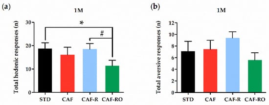 Total hedonic (a) and aversive (b) responses at the 1 M sucrose concentration in the taste reactivity test. The total number of hedonic responses was calculated as the sum of tongue protrusion, paw licking and mouthing responses. The total number of aversive was calculated as the sum of head shaking, forelimb flailing, snout cleaning and gagging responses. Data are expressed as the mean ± SEM. * p < 0.05 STD vs. CAF-RO group; # p < 0.05 CAF-R vs. CAF-RO group.