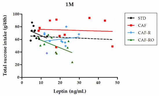 The correlation between leptin and the total sucrose intake was analyzed for each group (Figure 6). We found that at the highest concentration (1 M), the STD and CAF-RO groups showed a negative correlation between both parameters (rs = −0.636, p < 0.05, and rs = −0.636, p < 0.05, respectively), whereas the CAF and CAF-R showed no correlation.