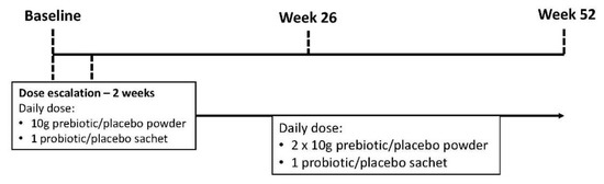 The study design (Figure 1) included a dose escalation to avoid potential adverse gastrointestinal symptoms. In both arms, the prebiotic/placebo were commenced at a one-half dose for the first 2 weeks, consisting of 10 g (one level scoop) of the prebiotic/placebo powder and one probiotic/placebo sachet. This was taken in the morning with food. Following dose escalation, participants included an additional prebiotic/placebo dose (10 g powder) with their evening meal. A qualified dietitian provided telephone consultations fortnightly for the first 2 months and then monthly for the remainder of the intervention to verify adherence and assess adverse events. If the participant experienced any adverse gastrointestinal symptoms associated with the supplement, the supplement dose was modified. Throughout the intervention, participants were provided individualized and tailored dietary advice in line with best practice guidelines and were encouraged to maintain a stable dietary intake, focusing on not altering protein and fiber intake.