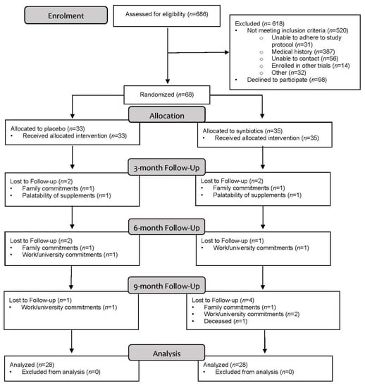 The retention rate was 82%, with 56 of the randomly allocated participants completing the 12-month intervention. Twelve (18%) participants withdrew from the study with no difference in withdrawals between groups (synbiotic: 7, placebo: 5; p = 0.60). Work or university commitments were the main reason for withdrawal (5, 42%) followed by family commitments or caregiver responsibilities (4, 33%). One participant from each group withdrew at week 2 and cited the palatability of the study products as the reason for withdrawal. The majority of withdrawals occurred at ≥6 months (8, 67%).
