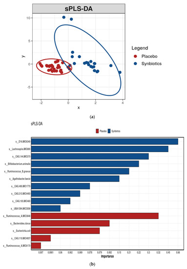 (a) sPLS-DA of gut microbiome composition by intervention. (b) Species differentiating between gut microbiota profiles of participants after placebo or synbiotic supplementation as identified by sparse Partial Least Squares Discriminant Analysis (sPLS-DA).