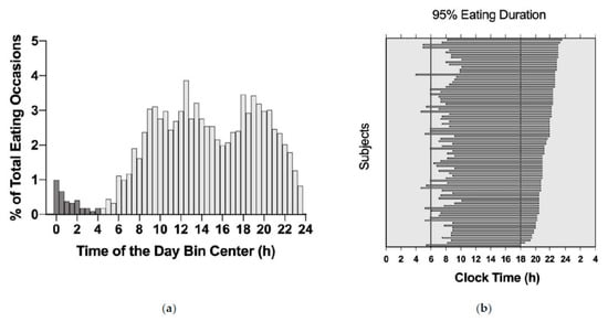The National Health and Nutrition Examination Survey (2009–2014) reveals that US adults report approximately five eating occasions per day, with breakfast occurring at approximately 08:00, dinner around 18:25 and the last eating occasion at 20:18 [4]. The distribution of calories is skewed toward the evening, with 45% of daily energy intake consumed with dinner and the after-dinner snack and <20% of total energy intake consumed at the breakfast meal [4]. Although intake is highly concentrated later in the day, eating-pattern analyses show the typical duration of the daily eating window is 12–15 h/d [3,4,7,8], with <10% of adults having an eating window <12 h/d [3]. While an eating-window cutoff has yet to be established, restricting the daily eating window to <12 h/d may confer metabolic health benefits, including improvements in glycemia, reductions in blood pressure, blood lipids, and body weight [9,10].