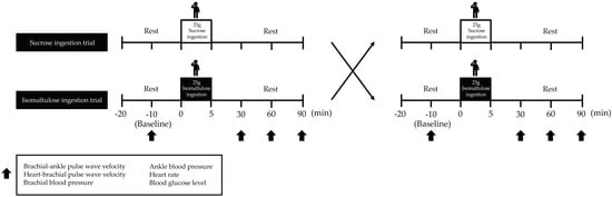 The increase in arterial stiffness occurs immediately after food intake [] and may be influenced by the glycemic index (GI) value of the cardiovascular disease indices []. In fact, vascular endothelial function, the underlying mechanism of arterial stiffness, varies with GI []. A previous study reported that arterial stiffness increased in middle-aged and older people consuming a glucose solution, but the changes differed between different carbohydrate intakes []. A high-GI diet has been shown to increase arterial stiffness compared with a low-GI diet. In other words, a low-GI diet may reduce the acute adverse effects on arterial stiffness []. For example, isomaltulose is a natural carbohydrate found in honey that has a low GI and is certified as a novel food (European Food Safety Authority) because of its nutritional quality []. Isomaltulose has similar amounts of sweetness and energy to sucrose; however, the rate at which it is broken down in the small intestine is slower than that of sucrose, which moderates the rise in blood glucose levels after ingestion []. In a previous study, a comparison of acute changes in blood glucose levels after the ingestion of isomaltulose or sucrose in 10 healthy subjects showed that the highest blood glucose levels were lower in patients who ingested isomaltulose than in those who ingested sucrose []. In addition, when 10 patients with type 2 diabetes were asked to consume either isomaltulose or sucrose and the changes in blood glucose levels after ingestion were examined, it was found that the blood glucose levels rose rapidly after sucrose ingestion and increased gradually after isomaltulose ingestion, with the peak values being lower for isomaltulose than for sucrose []. In other words, isomaltulose, which has a lower GI than sucrose, is expected to reduce the increase in arterial stiffness. However, the changes in arterial stiffness after ingestion of isomaltulose compared with that after the ingestion of sucrose are not sufficiently clear. Therefore, it is necessary to investigate whether arterial stiffness is altered after isomaltulose intake in healthy middle-aged and older people.