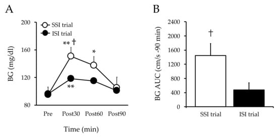 Changes in blood glucose at baseline and post-ingestion in both trials. Values are mean ± SD. ** p < 0.01 and * p < 0.05, vs. baseline. † p < 0.05, vs. ISI. BG, blood glucose; SSI, sucrose solution intake; ISI, isomaltulose solution intake; SD, standard deviation; Figure 3A, blood glucose; Figure 3B, blood glucose AUC.