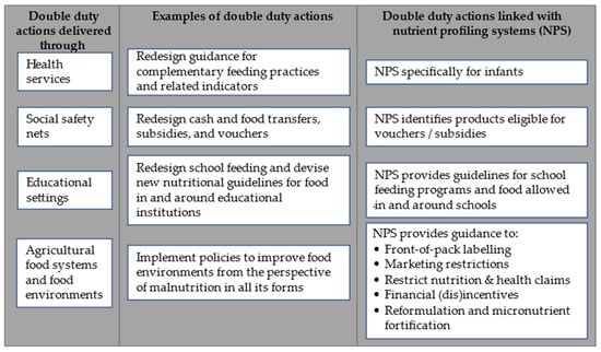 Examples of double-duty actions, addressing undernutrition, obesity, and diet-related non-communicable diseases, listed by Hawkes et al. [5], and how nutrient profiling systems (NPSs) could support them (authors’ analysis).