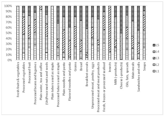 Distribution of products in the database over levels L1–L5 for basic food groups. Due to the use of WHO benchmarks and the validation against indicator foods, a relatively high percentage of fresh and processed fruit and vegetables, legumes, plain water, tea and coffee, and plain tubers are classified as healthier, whereas other food groups, such as flavored noodles and pasta, breakfast cereals, bread, and cheese contain more less healthy products.