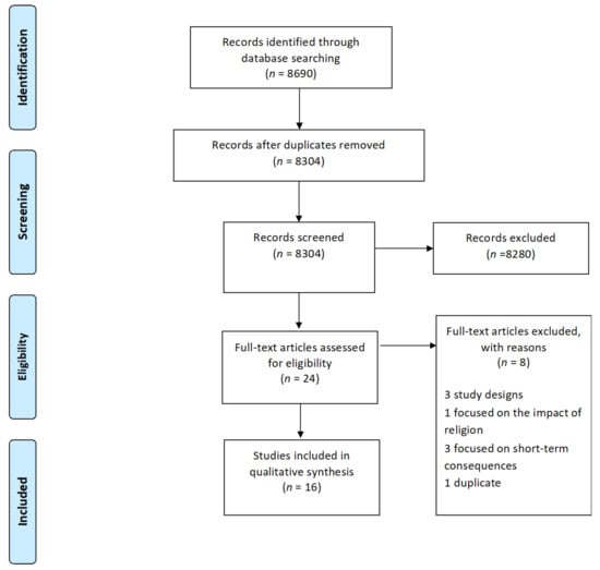 We identified a total of 8690 original research articles, of which 8304 remained after the removal of duplicates from the search results. Based on title and abstract screening, 8280 studies were excluded because they mostly focused on maternal or perinatal outcomes or on fasting adults. We screened the full text of 24 studies, of which 16 met the inclusion criteria (see Figure 1). Three studies were excluded because they did not present original research (commentaries), three focused on short-term consequences, one focused on the impact of religion adherence, and two studies were published twice in different journals with different titles; therefore, we only kept the primary publication.