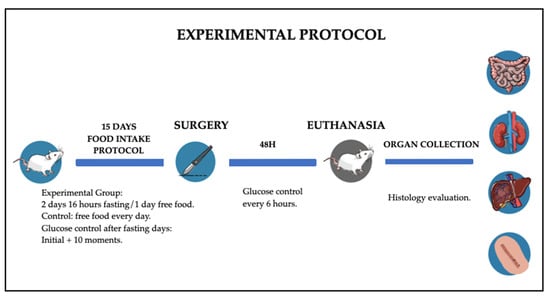 During the feeding protocol, blood glucose was measured (One Touch Ultra MiniTM/Johnson & Johnson do Brazil, Complexo JK, São Paulo, Brazil) in both groups in the mornings after the fasting days to search for possible hypoglycemia, and immediately after the surgery every 6 h.