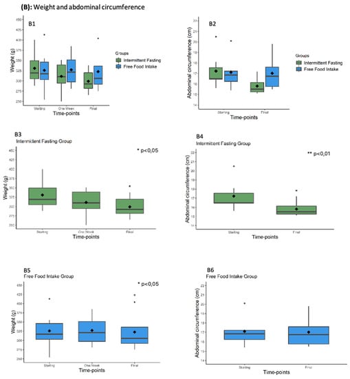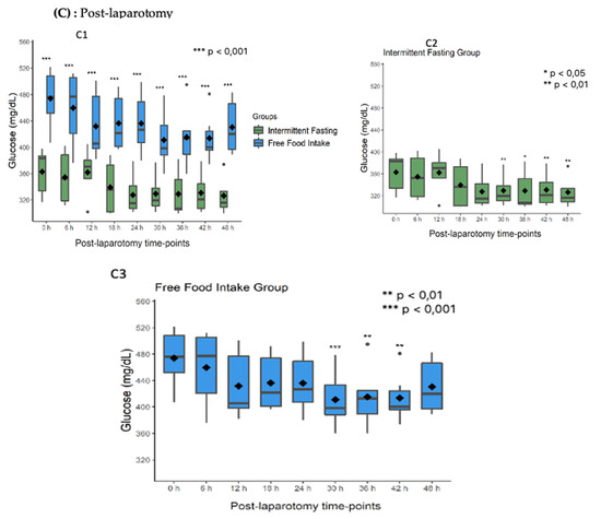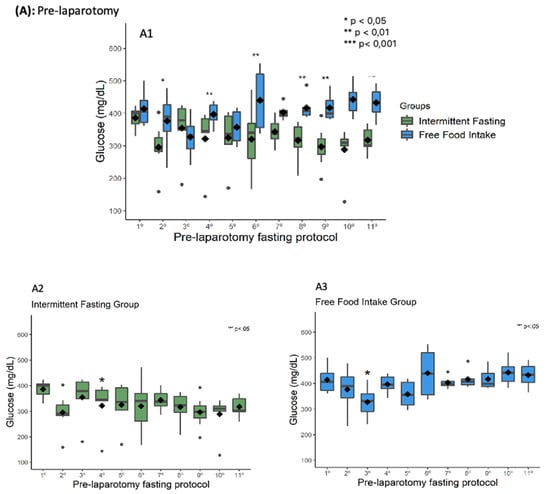 Green represents IF group. Blue represents FF group. * p < 0.05 ** p < 0.01 *** p < 0.001. The lower and upper bounds of the box represent the first and third quartiles of the data, respectively; the horizontal line plus space inside the box indicates the median; the diamond indicates the mean; black circles indicate outliers; comparisons were performed by mixed linear models. (A) Pre-laparotomy fasting protocol glucose levels showing comparison between groups (A1) and comparison over time in relation to the first time-point for only intermittent fasting group (A2) and free food intake group (A3). (B) Comparison of the weight and abdominal circumference between groups (B1/B2) and comparison over time in relation to the starting time-point for only intermittent fasting group (B3/B4) and free food intake group (B5/B6). (C) Post-laparotomy fasting protocol glucose levels showing comparison between groups (C1) and comparison over time in relation to the first time-point for only the intermittent fasting group (C2) and free food intake group (C3).