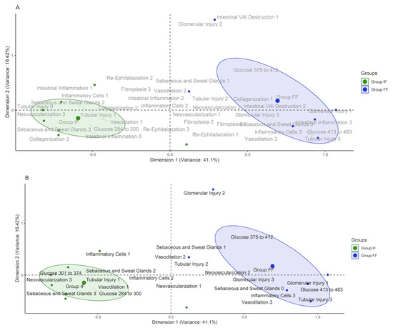 Perceptual map of the first and second dimensions of the multiple correspondence analysis with the qualitative findings of histopathology, experimental groups and glucose classes. In (A), all the qualitative variables applied in the analysis are presented, and in figure (B) only those with interdependencies by the chi-square test.