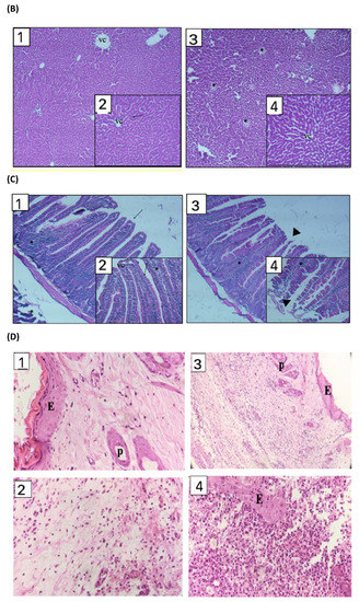 Box 1;2 represents IF group while Box 3;4 represents FF group. (A)—Kidney: tp: proximal tube; g: glomerulus; arrows: tubular damage; *: proximal and distal tubular damage. (B)—Liver: vc: centrilobular vein; arrows: hepatocytes; *: necrosis. (C)—Duodenal segment: arrows: intestinal villi; *: inflammatory cells. (D)—Operative Wound: E: epithelium; p: hair follicles.