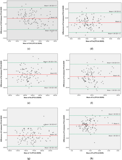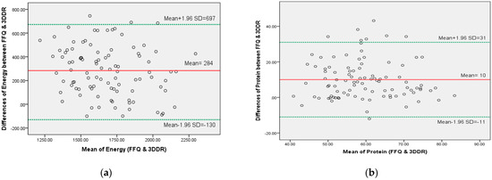 Bland-Altman plots pictured the agreement of the BDHD-FFQ with 3DDRs (Figure 2). In view of the Bland-Altman index, a positive mean difference (mean bias) was apparent for all nutrients, and the percentage data points within the limit of agreement (mean ± 1.96 SD) are above 95% for energy, carbohydrates, fat, iron, sodium, and potassium, with the exception of protein, phosphate, and calcium (Table 7). Acceptable validity for the Bland-Altman method is that the 95% limit of agreement, including 95% of differences between the two dietary methods [50].