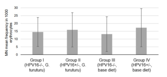 In the comet assay, a significant GDI decrease in transgenic mice supplemented with seaweed was observed compared with transgenic mice fed a standard diet (p = 0.025) (Figure 1A). Conversely, the wild-type group supplemented with seaweed (group I) showed a significant increase in the genetic damage (as GDI and GDIFPG) compared with the wild-type group fed the standard diet (group III) (p = 0.032 for and p = 0.042 GDIFPG) (Figure 1A). There was also a significant increase in the NSSFPG level of the transgenic group supplemented with seaweed (group II) compared with the corresponding group fed with a standard diet (group IV; p = 0.038) (Figure 1B). In the micronucleus test, all experimental groups showed similar frequencies (Figure 2).