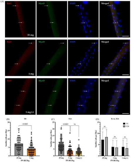 Effects of vitamin B6 deficiency on satellite cell numbers at the quiescent state (0 h) and viability after being activated for 24 h. (A) Representative images demonstrating satellite cells stained with Pax7 (arrows) and MyoD on a single fiber at 24 h of culture (scale bar = 50 μm). (B) Quantified data showed the number of quiescent satellite cells on myofibers without culturing (0 h of culture) (4 mice were used per group, ≥15 myofibers per mouse; n = 65 myofibers (35 mg) and n = 77 (1 mg)). (C) Quantified data showed the number of activated satellite cells on myofibers following 24 h of culture (3–4 mice were used per group, ≥15 myofibers per mouse; n = 95 myofibers (35 mg), n = 65 myofibers (1 mg), and n = 50 myofibers (1 mg (−))). (D) Comparison of the number of satellite cells per myofibers between 0 h (b) and 24 h (c) of culture. 1 mg (−) indicates the vitamin B6-deficient myofibers cultured in the vitamin B6-free medium. 35 mg PN HCl/ kg and 1 mg PN HCl/kg represent the vitamin B6-supplemented group and the vitamin B6-deficient group, respectively. Values represent the means ± SD. p value < 0.05 was considered statistically significant (unpaired t-test). ns = no significance.