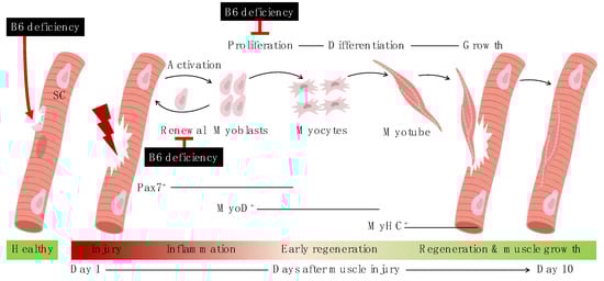 Events during myogenic progression upon injury and effects of vitamin B6 deficiency on satellite cells. SC, satellite cells; B6, vitamin B6 (PN HCl). Created with BioRender.com (accessed on 12 December 2021).