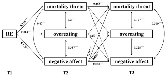 The cross-lagged model of the RE-overeating association. The figures represent the standardized regression coefficients of significant paths. RE = restrained eating. *** p < 0.001. T1, pre-pandemic; T2, the middle of the COVID-19 crisis; T3, the end of the COVID-19 crisis.