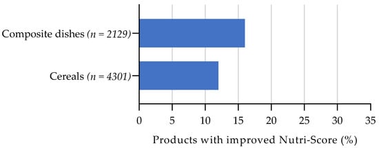 For sugar, the largest potential improvement in Nutri-Score was found for milk products (with added sugar) (31%), followed by sugary drinks and sweetened cereals (see Figure 4). The smallest overall improvement was found for sweetened baked goods and confectionery (6%). A one-point decrease in sugar content (i.e., −4.5 g per 100 g food and −1.5 g per 100 g for drinks) is relatively large compared to the median content in milk products (38%), whereas this is smaller in cereals (8%). Reducing the sugar content in cereals, by one point, may be achievable.