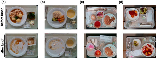 Sample images before and after meal consumption from Geriatrische Klinik St. Gallen (a,b) and from the Bern University Hospital [24] (c,d).