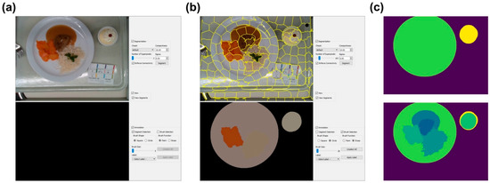 The segmentation tool that was used to provide the ground truth of the segmentation (GTseg): (a) the interface of the segmentation tool; (b) the semi-automatic segmentation; (c) the segmented plates of the images (up) and food types (bottom).