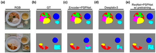 Figure 7 also shows the comparison between the segmentation results of the Deeplabv3, the Encoder + PSPNet, and the ResNet + PSPNet with (w/) pretraining network architectures (with the plate module) for two sample images. The background is shown in grey, the soup in blue, the meat/fish dish in green, the side dish in yellow, the sauce in red, the salad in pink, and the dessert in light blue. Even though the output segmentation masks for the first exemplary image are quite similar for the different architectures, the masks for the second exemplary image prove the point that the ResNet + PSPNet w/pretraining outperforms the other networks. It is the only network that accurately predicts the dessert, without confusing it with the other categories; therefore, we use the ResNet + PSPNet w/pretraining as the segmentation network of our system.