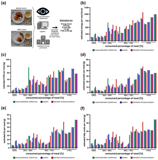 Bar plots for the 20 testing meals ordered by consumed percentage of each meal. (a) Schematic depiction of the workflow. Estimations for the (b) energy (kcal); (c) CHO (g); (d) protein (g); (e) fat (g); (f) fatty acids (g) intake. The green bars indicate the visual estimations of the dietitians and the student (reference), the blue bars indicate the system’s estimations, and the red bars the nursing staff following the standard clinical procedure.