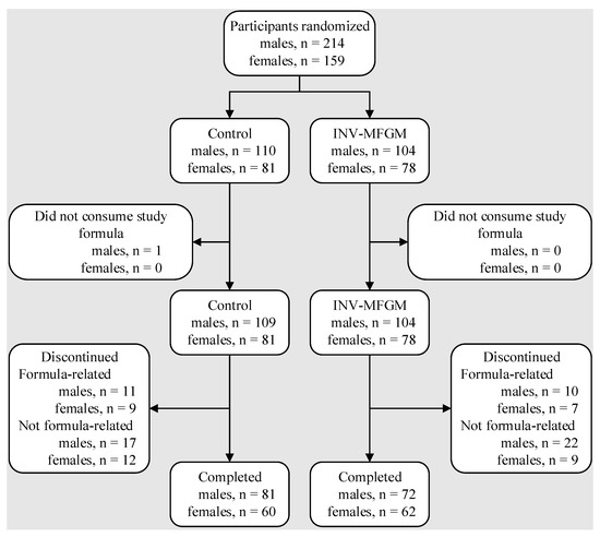 A total of 373 participants were enrolled and randomized (control: n = 191; INV-MFGM: n = 182); 275 completed the study (control: n = 141; INV-MFGM: n = 134). Participants who were randomized but consumed no study formula (Control: n = 1) were excluded from analyses (Figure 1). Sex, race, and ethnic distribution and birth anthropometric measures were similar between groups (Table 2). No differences in body weight, length, or head circumference were observed by sex among groups at study enrollment.
