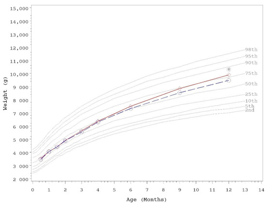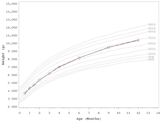 Growth rates were analyzed from 14–120 days of age. As outlined in AAP guidelines, rate of weight gain is used as the most important parameter in clinical evaluation of IFs, with differences of >3 g/day over a 3–4 month period considered clinically significant [43]. No statistically significant group differences in the primary outcome, weight growth rate from day 14–120, were detected by sex (Table 3). No statistically significant group differences were detected for weight, length, or head circumference growth rates by sex for any measured range. In addition, no statistically significant differences were observed for mean achieved weight, length, or head circumference at any measured time point up to day 365 with the exception of mean achieved weight in female infants at day 365 (control, n = 60; 9892 ± 140, INV-MFGM, n = 62; 9468 ± 138; p = 0.034). Mean achieved weight on the WHO weight-for-age standard growth chart [47] for males (Figure 2) and females (Figure 3) in the control group remained between 25th–75th percentiles of growth through day 180 and tracked near the 75th percentile through day 365. Females in the INV-MFGM group tracked similarly through day 180 and remained between 50th–75th percentile through day 365.