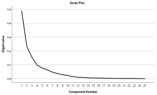 Principal component analysis (PCA) was used to extract the nutrient patterns based on the QFFQ-derived intake of 25 nutrients. Of these 25 nutrients, total protein was split into animal protein and plant protein; total carbohydrates into total sugar, starch, and total dietary fibre; and total fat categorised as saturated, monounsaturated and polyunsaturated fat. Alcohol was not considered as a nutrient and not included in deriving the nutrient pattern analysis. The nutrient intake variables were log-transformed to remove bias due to variance of the different measures of scale used to quantify the nutrients. Log transformation gives an advantage as it renders the variances and covariances independent of scale. To control for the variability of nutrient intakes from variation in energy intake, nutrients (log variables) were adjusted for log total energy intake before applying the PCA using the nutrient density approach suggested by Willet [32]. PCA was performed with the variance based on the covariance matrix and Varimax rotation. The PCA was a suitable data reduction approach for the nutrient data in this study, as was indicated by a Kaiser–Meyer–Olkin measure of sampling adequacy of 0.911 and a significant (p < 0.001) Bartlett’s test of sphericity. PCAs were first performed separately for both sexes. However, as the men and women had similar nutrient patterns, the two groups were combined for all subsequent analyses. The retained patterns were determined considering several criteria, including the interpretation of the patterns, the percentage of total variance explained and visual inflexions in the scree-plot (Figure 1) [35]. Nutrient patterns were named using the nutrients with absolute loadings greater or equal to 0.47 [28,37]. Nutrients with positive loadings were significantly associated with a nutrient pattern, while negative loadings were negatively associated.