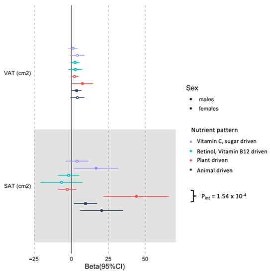 Associations between the derived nutrient patterns and the selected body composition traits in men and women are presented in Table 3. The plant driven nutrient pattern was not associated with any of the total or regional adiposity measures. However, there was a significant sex*plant driven nutrient pattern interaction for abdominal SAT (Pint = 1.54 × 10−4), with the association being significant in women (44.0 cm2, 95% CI (21.9; 66.5 cm2); p = 1.21 × 10−4) but not men (–3.0 cm2, 95% CI (–9.52; 3.30 cm2); p = 0.341) as shown in Figure 2.