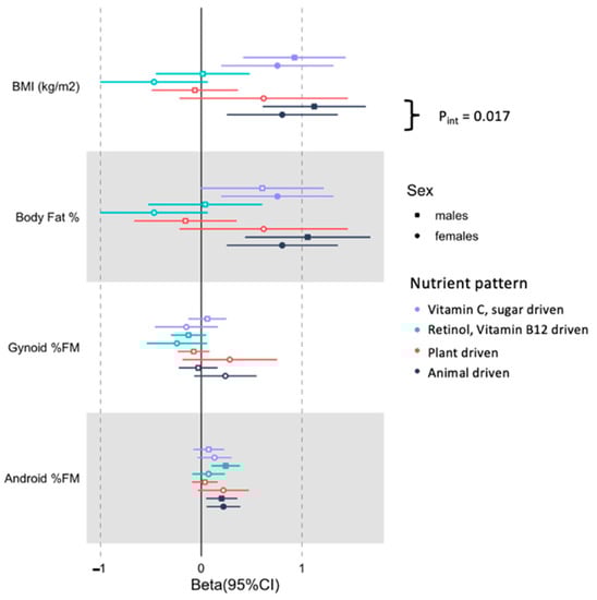 Stratified associations of total and regional adiposity with nutrient patterns in middle-aged black SA men and women. The associations are adjusted for age, number of steps, education status, SES status and energy intake reporting. A significant interaction between sex and animal-driven nutrient pattern on BMI was noted (Pint = 0.017). Non-significant effect sizes are indicated as hollow.