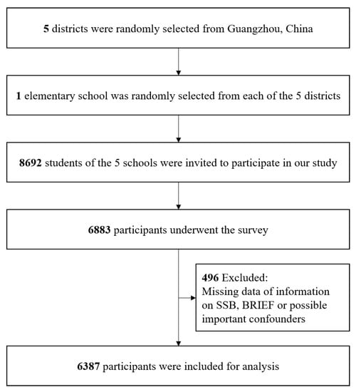 Data comes from a cross-sectional study, which was implemented in Guangzhou, southern China from April to May 2019. We performed a two-stage cluster sampling strategy to recruit study participants. First, we randomly selected five districts including three urban areas and two suburban areas in Guangzhou city. Second, we randomly selected one elementary school within each district, which generated five elementary schools. Finally, all students from the selected five schools were invited to participate. The above sampling strategy generated 8692 eligible participants, of whom 6883 children and parents agreed to participate, giving a response rate of 79.2%. We additionally excluded 496 children without information on SSB, executive function or possible important confounders, leaving a final sample of 6387 participants aged 6–12 years (Figure 1).