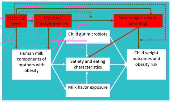 In addition to macronutrients, elevated concentrations of leptin and insulin in human milk may also play an important role [8]. Insulin and leptin are actively transported from the mother to the infant through human milk more consistently from the beginning on [13,14]. Notably, while leptin concentrations in human milk were positively associated with lower child weight outcomes shortly after birth (i.e., first weeks to months) [15,16], positive associations of leptin with accelerated increases in child weight outcomes have been found later on [16]. Leptin is a well-known satiety hormone that suppresses appetite, which might explain why exogenous leptin from human milk may initially be associated with lower infant weight. Though speculating, leptin might play a role in later accelerated increases in child weight outcomes through leptin resistance, reinforcing “reward eating” beyond caloric requirements [17]. To conclude, human milk composition may play a pathogenic role in mother-to-child transmission of obesity through child eating and satiety characteristics [18]. However, mediation by child gut microbiota and flavor exposure may also play a role (see Figure 1).