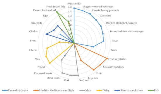 Six patterns of change in food consumption during confinement were identified, which explain 53.8% of the variance. Figure 2 shows factor scores of the matrix of rotated components. A pattern was characterized by shifts toward increased consumption of alcoholic and sugary beverages, salty snacks, cookies, bakery products, chocolate, and pizza (Unhealthy snack foods and beverage pattern). The Healthy Mediterranean-Style dietary pattern showed changes toward higher consumption of fresh and cooked vegetables, fruits, legumes, and fish. A Meat pattern described changes toward greater consumption of different kinds of meat. The Dairy pattern was characterized by higher consumption of dairy products and, to a lesser extent, eggs. The fifth pattern described a higher consumption of chicken, rice, pasta, eggs and, to a lesser extent, legumes (Rice–pasta–chicken pattern). The sixth pattern showed higher consumption of fresh, frozen, and canned fish (Fish pattern).