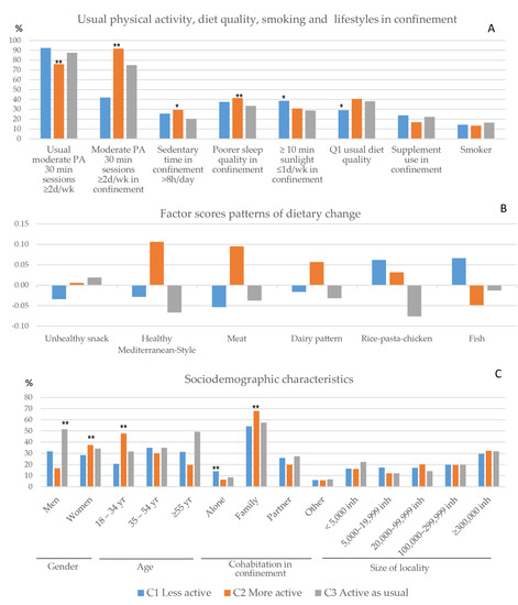 Characteristics of the clusters of changes in lifestyles in confinement. (A) Lifestyles: Usual moderate physical activity (PA) and moderate PA in confinement (≥2/week 30-min session), sedentary time in confinement (>8 h/day), poor sleep quality in confinement, exposure to sunlight in confinement (≤1 day/week), usual diet quality (Q1), consumption of supplements in confinement, and smoking. (B) Factor scores of patterns of dietary change. (C) Sociodemographic characteristics. PA: physical activity; d: day: wk: week; Q1: first quartile of usual diet quality score; inh: inhabitants. ** p < 0.01; * p < 0.05 χ2 test.