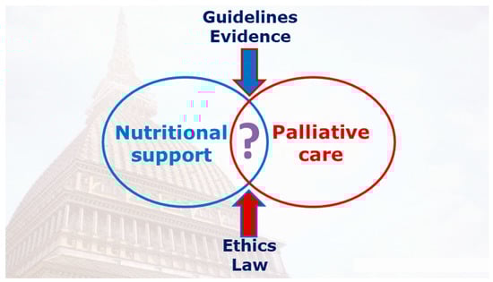 The purpose of this narrative review is intended to be a brief guide to prescribing nutritional support based on the European Society for Clinical Nutrition and Metabolism (ESPEN) guidelines [9] and analysis of the literature evidence in palliative cancer patients. Specifically, the aim is to identify in the cancer patient the area of overlapping between the two therapeutic approaches, consisting of nutritional support and palliative care, in light of the variables that determine their identification (guidelines, evidence, ethics, and law) (Figure 1).
