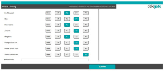 After this initial session, patients were asked to record their food intake after each meal via the EFS. This involved opening the EFS portal from their bedside computer, selecting the day and meal (e.g., Monday breakfast) and selecting the amounts consumed for each meal item, presented in quartiles (see Figure 1). The EFS would only show the meal items ordered by and delivered to that patient on the intake tracking page. The EFS then calculated the patients’ energy (kJ) and protein (g) intakes for each meal and each day, and displayed this information on the nutrition goals page, alongside their individually estimated energy and protein requirements (see Figure 2).